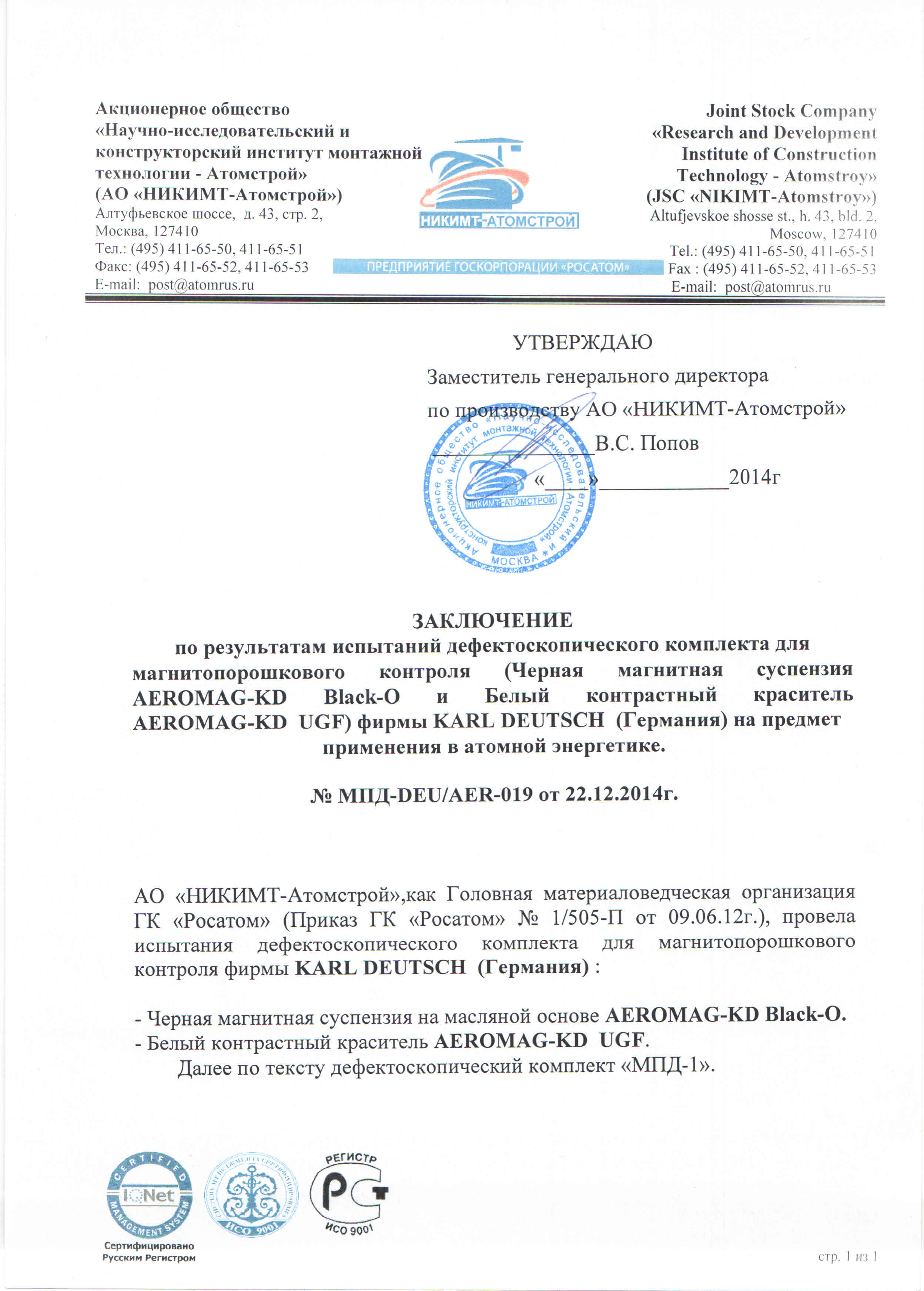 DIN EN ISO 9934-2, AREVA NP TLV 9017 (Дальнейшая сертификация международным стандартам по запросу)